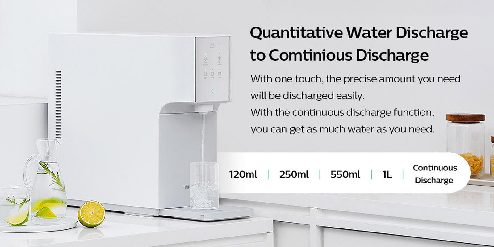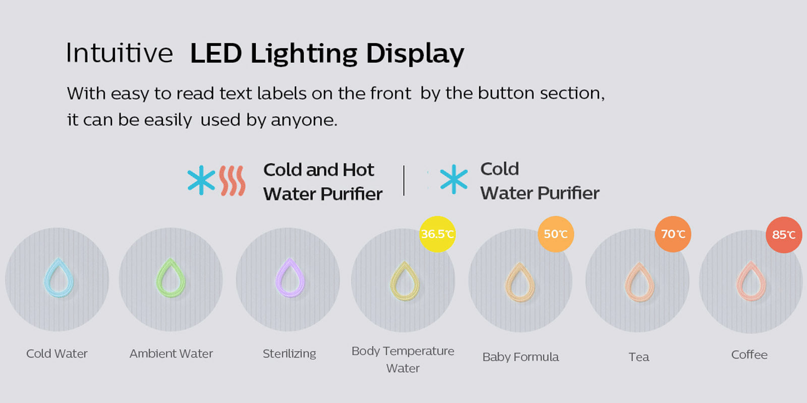 Intuitive LED display, quantitative and continuous water discharge functions, and hot water lock function.